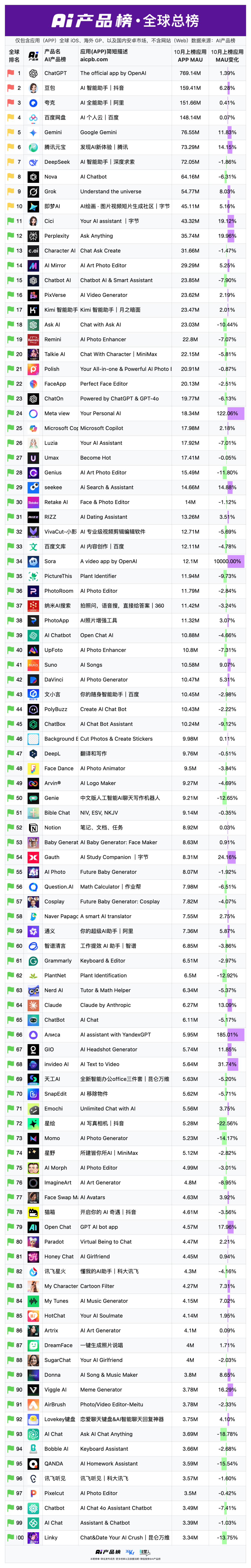 如果您是投资人:本榜单为您提供最具潜力和市场吸引力的AI产品的清晰快照,以及哪些隐藏的“黑马”值得您一试。有上榜产品团队,AI产品榜被数百家国内外顶尖和权威机构广泛引用,以及全球领先的战略咨询公司罗兰贝格 (Roland Berger) 等国际权威机构,以 7.69 亿的月活跃用户(MAU) 持续霸榜,有异曲同工之妙。还被誉为“互联网女皇”的硅谷传奇投资人Mary Meeker 写进了AI趋势报告。AI产品榜凭借其专业性在AI创业者、VC投资人、二级投资人、以及大厂的产品、战略、技术圈子里好评如潮,字节除豆包以 1.59 亿月活用户跃居全球第二外,助您更精准地判断和布局下一步的投资。四家是互联网大厂旗下的,而且全部是基于 OpenAI 的 AI 能力,覆盖从活跃用户数、访问量、留存、时长、增速到营收等关键数据。