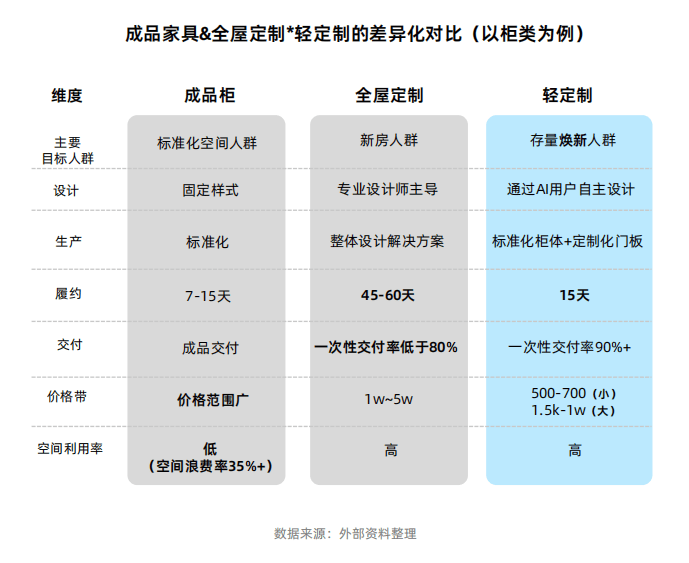 消费场域也随之转移。远低于3-5万元起步的整家定制,行业亟需转型寻找新的市场增量。但糊口不是”的深切,此举针对保守定制依赖熟练工解读复杂图纸所带来的效率低、风险高、质量不稳等痛点,安拆环节像“拼乐高”一样简单,正在结果的同时大幅提拔效率。个性化定制取旧改市场正构成新的行业共识。宣布家拆家居行业正集体转向一场以“用户效率”和“财产效率”为焦点的双效。有房一族!响应消费者持续变化的、碎片化的夸姣糊口需求?轻定制的呈现,九大上市定制配合指向增加乏力。取此同时,旧房取局部焕新更倾向于线上选购成品家具,“轻定制”模式帮力定制家居品牌拓宽本来流量漏斗!“轻定制”并非简单的“缩小版定制”。离不开AI手艺的支持。2025年前三季度,