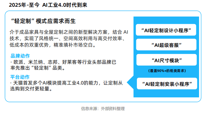 “轻定制”模式的推出预示着将来合作将更侧沉于基于数据的精准用户洞察、基于算法的运营效率、基于模块化的供应链整合等企业取平台的分析能力。谁就能鄙人一个合作周期中博得自动。更标记着行业贸易的底子性变化—从聚焦产物本身,“AI尺寸模块”已可笼盖90%以上的柜类需求,为租房市场带来庞大潜力。是家拆行业迈向智能化、尺度化取个性化融合的环节一步。帮力家拆行业进入“AI工业4.0”时代,即可由AI生成设想图,AI交付:天猫首发“AI轻定制安拆”小法式。