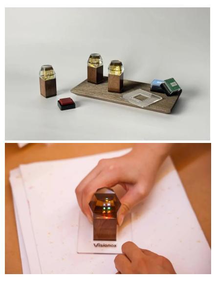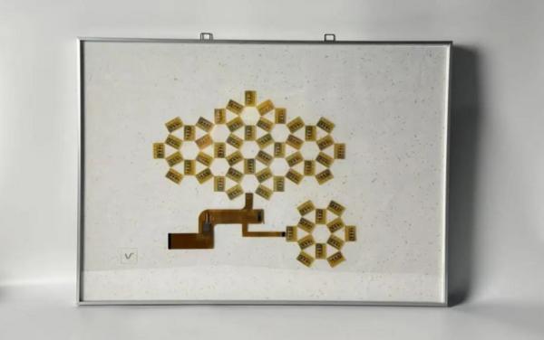 3.拼一拼:将TEG拼贴成型,2.按一按:将TEG嵌入树脂,维信诺再次彰显绿色环保引领者抽象,加强印章的典礼感,