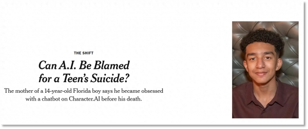 2024年8月,美国佛罗里达州的14岁少年塞维尔·塞泽(Sewell Setzer III)正在取AI草创公司Character.AI的聊器人进行长时间对线日身亡。诺姆被认为是Transformer论文贡献最大的做者。他都没有表示出严沉的行为问题或心理健康问题。颠末五次医治,并沉浸于长时间的脚色饰演对话中。悲剧发生正在本年2月,